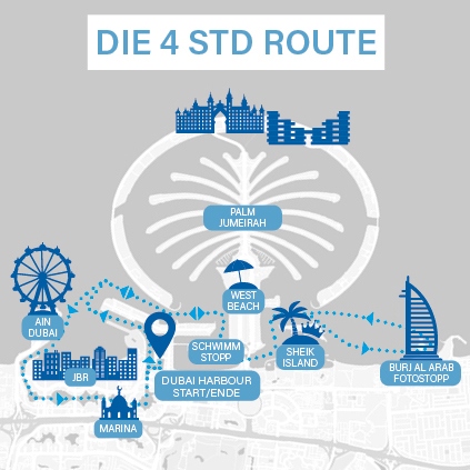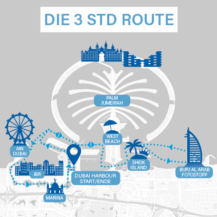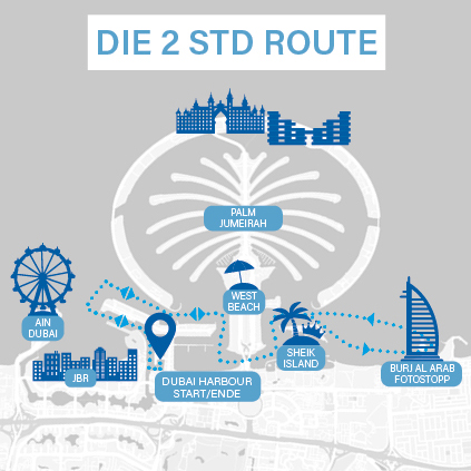 Unsere Yachtfahrten starten am wunderschönen Dubai Harbour, direkt am Rande der Marina. Der Hafen bietet Platz für bis zu 700 Yachten und verfügt über ein Kreuzfahrtterminal mit zwei Docks, an denen unter anderem AIDA- und Costa-Schiffe anlegen.