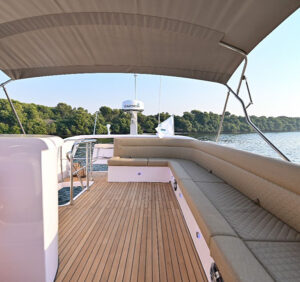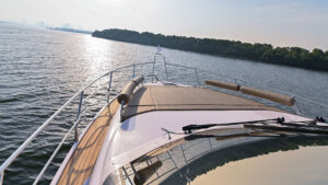 Genieße den herrlichen Blick auf die Marina-Skyline und das spektakuläre Skydive Dubai. Von unserer Yacht aus kannst du die Fallschirmspringer aus nächster Nähe beobachten – näher kommst du an die Landebahn kaum heran.